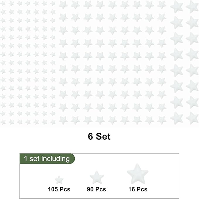 - 6 Set x glow in the dark stickers, 1 set including 16 pcs x 15mm Stars, 90 pcs x 10mm Stars,105 pcs x 5mm Stars,totally 211 pcs,6 Set in total 1266 pcs; Color: Blue; Adhesive: self-adhesive; Style: Stars