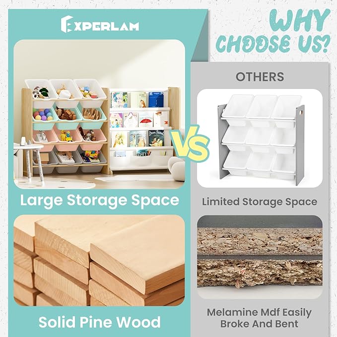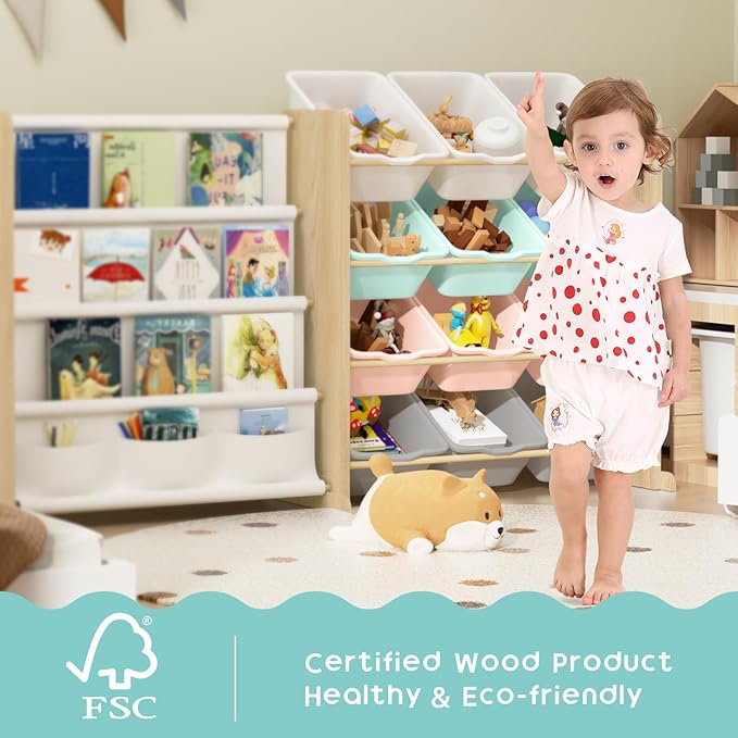 - Large Storage Space: The 12 toy bins and 4 shelves of this toy storage with kids bookshelf provide a large capacity storage area , which eliminates the need for children to rummage through boxes in order to locate their toys. This toy organizer is an ideal solution for storing books and toys for play room, nursery, or kids room.