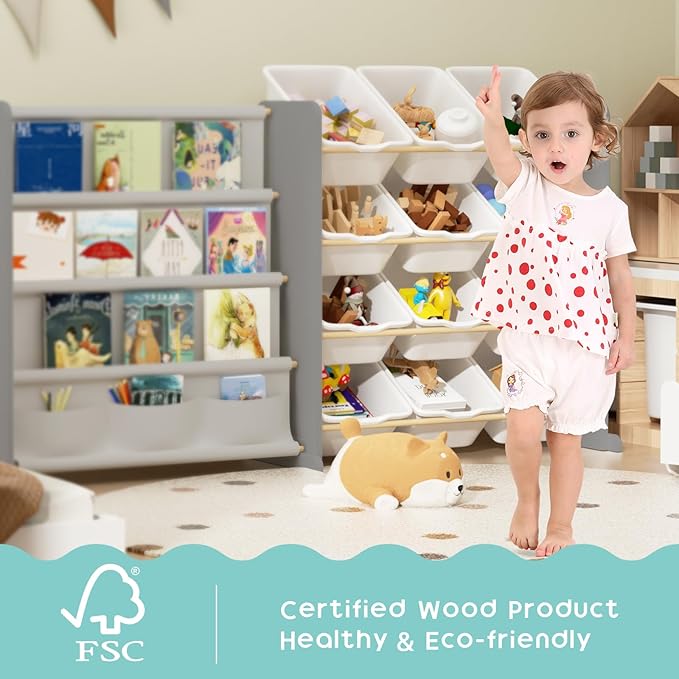 - Large Storage Space: The 12 toy bins and 4 shelves of this toy storage with kids bookshelf provide a large capacity storage area , which eliminates the need for children to rummage through boxes in order to locate their toys. This toy organizer is an ideal solution for storing books and toys for play room, nursery, or kids room.