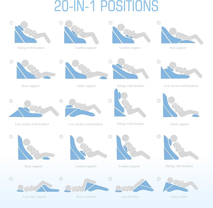 - 20-IN-1 VERSATILE DESIGN: The bed wedge is available in 20 combinations and adjustable height options to meet individual requirements for different sleeping positions and needs, and can be used as a headboard, head support, back support or leg pillow. Bed pillow wedge promote spine health, relieve muscle tension, and ensure comfortable relaxation, and can be used not only for sleeping, but also for leisure activities such as watching TV or reading.