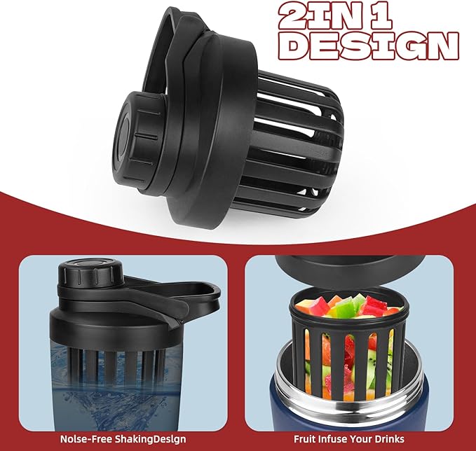 - [INNOVATIVE UPGRADED NOISE-FREE SHAKING DESIGN]:The UPGRADED noise-free shaking design, compared to the traditional old-fashioned shaker ball, our integrated removable agitator won't rattle and make a mess when you're mixing your supplements.You can also add small pieces of fruit to the adapter to create your favorite flavor.
