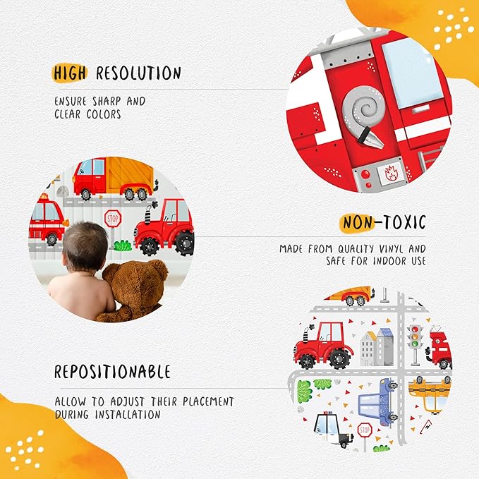 - π¦ Nursery decor for kids rooms includes: car, police car, truck, excavator, fire truck, taxi, tractor, crane as well as houses, roads, signs and trees to instantly bring a boring wall to life. Item sizes range from 2" x 2" to 6.2" x 11", for a total of 58 items. Stickers come in an envelope in 5 sheets. Sheet size is 13.8" x 7.8".