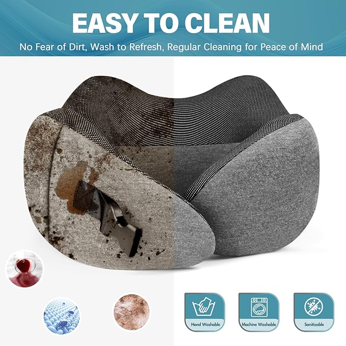 PORTHOLIC 2024 Upgraded Travel Neck Pillow with Buckle,100% Pure Memory Foam Travel Neck Pillow for Airplane Travel Flight Headrest Sleep, Portable Plane Accessories(Light Grey)