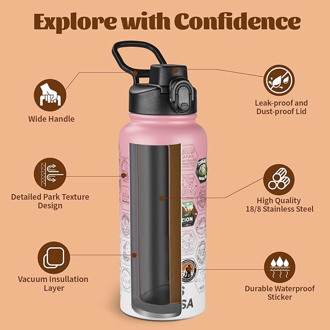 National Parks Water Bottle with Stickers and Straw,32oz Double Wall Vacuum Wide Mouth Insulated Water Bottle for Travel,BPA-free and Leak-proof (32oz,Pink White)