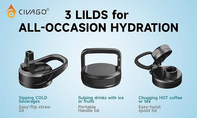 - INSULATED WATER BOTTLE: Featuring advanced vacuum insulation technology, CIVAGO 24 oz water bottle keeps your drink HOT for 12 hours and COLD for up to 24 hours, allowing you to enjoy icy cold drinks after intense workouts or hot coffee while winter camping