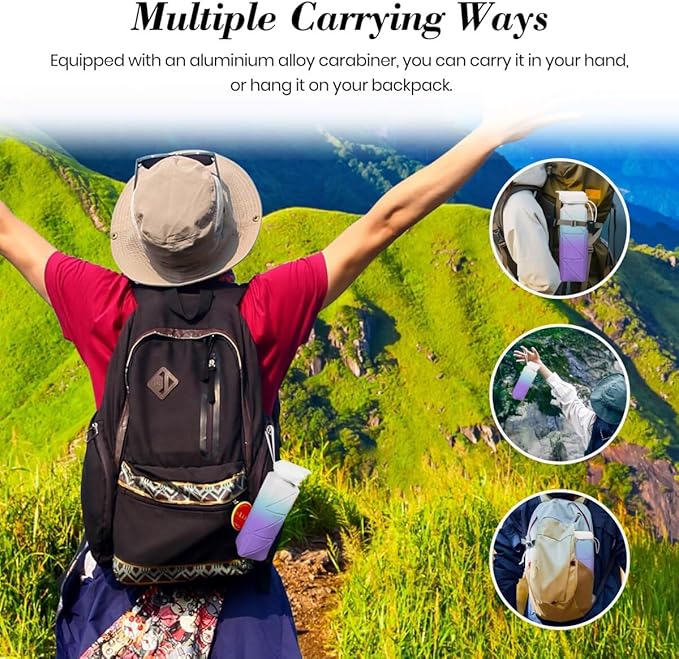 - Highly portable and foldable: Our foldable water bottle is made of food-grade silicone with an extensively tested double leak-proof design. This foldable water bottle is designed to save space by folding or rolling up when not in use. It is perfect for travel, hiking, office, home, gym, sports, etc. This foldable silicone water bottle is your intimate companion for travel.