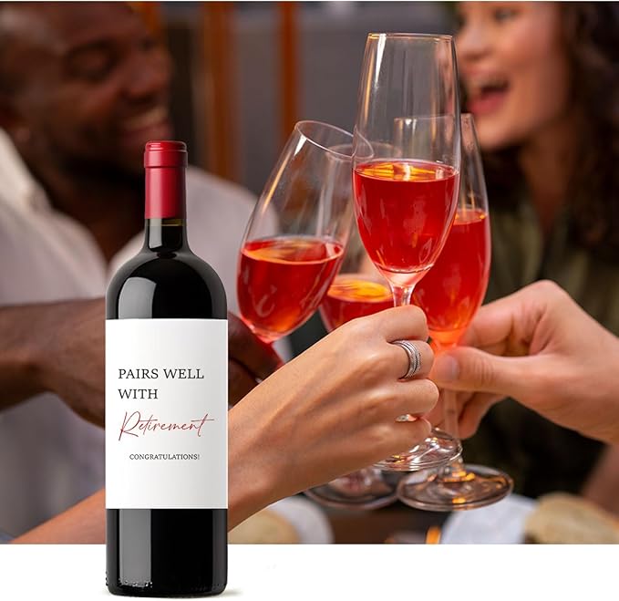 - 【Funny Retirement Wine Labels】Make retirement more fun! Our retirement wine label says "Pairs Well with Retirement", these unique wine labels are the perfect way to celebrate a successful retirement with funny sayings that everyone will love. Make memories last with these retirement wine bottle stickers.