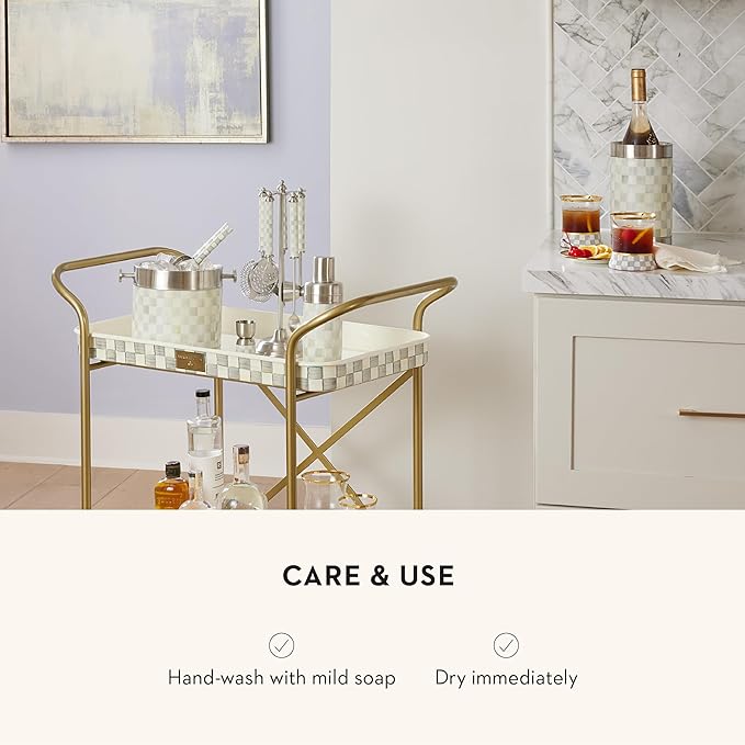 - ELEGANT BAR ESSENTIAL: This wine bucket is made of stainless steel with brass handles. It features hand-painted gray-and-white checks woven by an artisan’s brush and has a clear enamel coating.