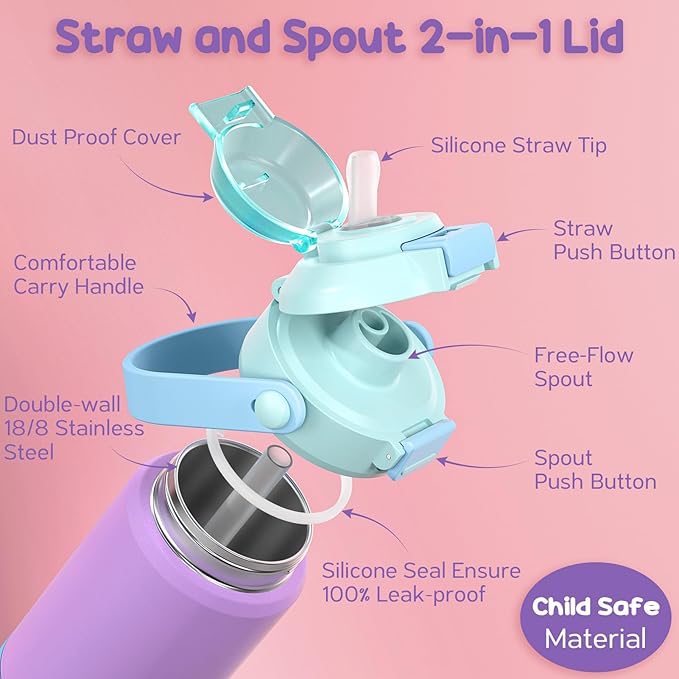 - Maintenance & Guarantee: This water bottles for school for kids girls includes 1 18oz Toddler Stainless Steel Water Bottle, 1 Leak Proof Lid, 2 Straws, each part is dishwasher safe, though washing by hand is recommended to maintain the vibrant color.We take pride in the superb quality of the 2024 newly built to last water bottles for school, and are committed to ensuring that our customers are completely satisfied with their purchase, send us your issues for solution if any question occurs.