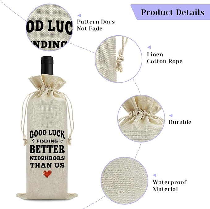 - Moving Away Gift for Neighbor:The size of this wine gift bag is about 36x16cm(14.2 inch*6.3 inch), with a thick hemp rope to easily close and open.The housewarming gift wine bags are made of high quality natural linen fabric material. It can hold a standard 750ml champagne bottle, Burgundy bottle, and wine bottle. can also put other small gifts into the bag. Tighten the drawstring to protect your bottle from being exposed, funny quotes and saying, leaving wonderful memories for you.