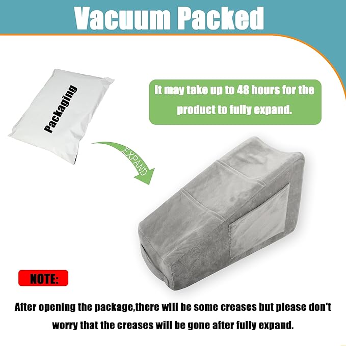 - ABOUT PACKAGING: Our arm support pillow measures 15.57 inches x 9.4 inches x 7.9 inches. In order to better protect the sponge inside during transportation, our bed armrest pillows are vacuum packed; wait about 48 hours after opening the package to allow the pillow to completely return to its original shape, or by tapping, pressing or Sunlight exposure helps the pillow recover faster. A simple, affordable and efficient solution for all your arm support needs.