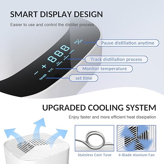 - 【Safe Operation & Efficient Cooling】Dry-burning protection automatically shuts off the distilled water machine when temperatures exceed 239°F (115℃) or the water level is low, preventing damage. After cooling, simply press the on/off switch on the display to restart. An advanced cooling system with a built-in 4-blade aluminum fan and SUS304 double-disc condensing coil ensures rapid heat dissipation, enhancing efficiency and extending the machine's lifespan.