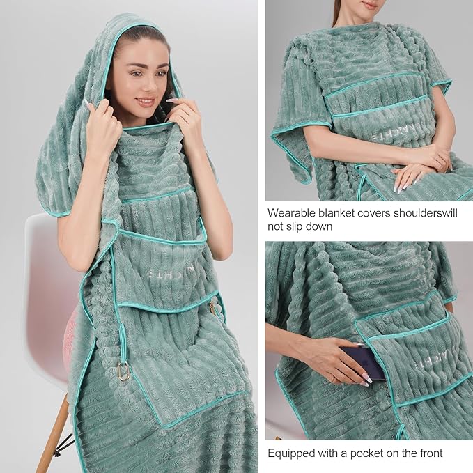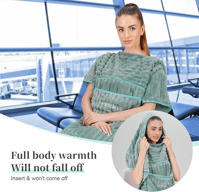 - A soft blanket seamlessly combined with a travel pillow, featuring an opening through which you can slip your head, allowing the blanket to drape over your shoulders. This design ensures the blanket stays in place while sleeping, reading, or changing positions, preventing it from slipping off and providing additional warmth by covering your shoulders.