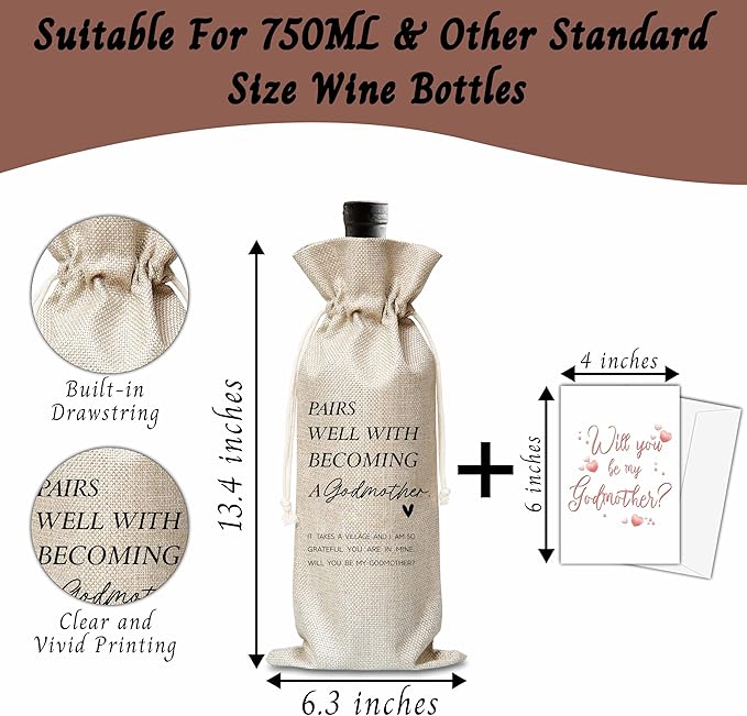 Xanev Godmother Wine Gift Bag For Women, Godmother Proposal Gifts, Pairs Well With Becoming Godmother Wine Bag, Baptism Gifts For Godmother From Godchild, Birthday Wine Party Favors Decor, B04
