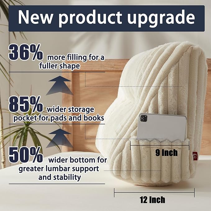 - [Thicker bottom and wider storage bag] This improved headboard pillow has increased the bottom depth by 50% and the pocket width by 85%. The thick bottom provides sufficient lumbar support and stability, and the greatly widened storage bag allows you to store large-sized pads and books, which is unique.