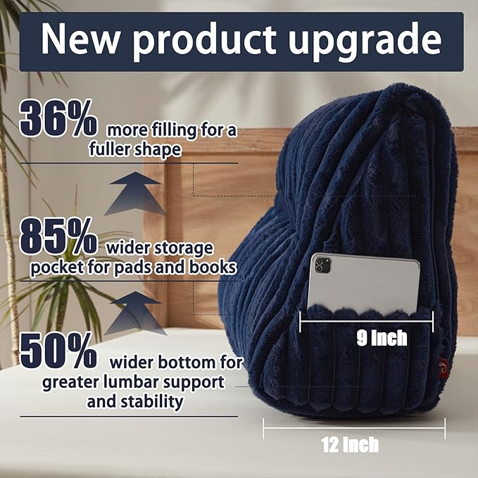 - [Thicker bottom and wider storage bag] This improved headboard pillow has increased the bottom depth by 50% and the pocket width by 85%. The thick bottom provides sufficient lumbar support and stability, and the greatly widened storage bag allows you to store large-sized pads and books, which is unique.