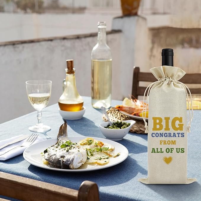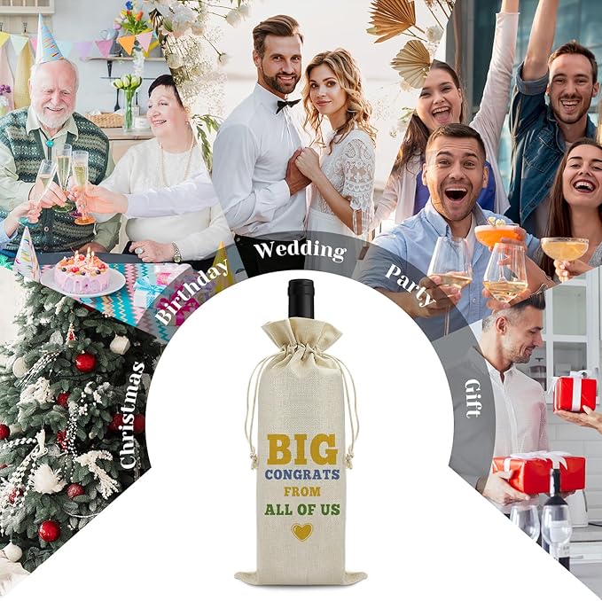 - Congratulation Gift for Women/Men: The wine bags printed with "BIG CONGRATS FROM ALL OF US". It is a great congratulations gift for women, men, friends, sister, best friends, daughter, son, niece, nephew, uncle, aunt, grandma, godmother, coworker, teacher, nurse, boss etc. Friends will be impressed when they receive this gift.