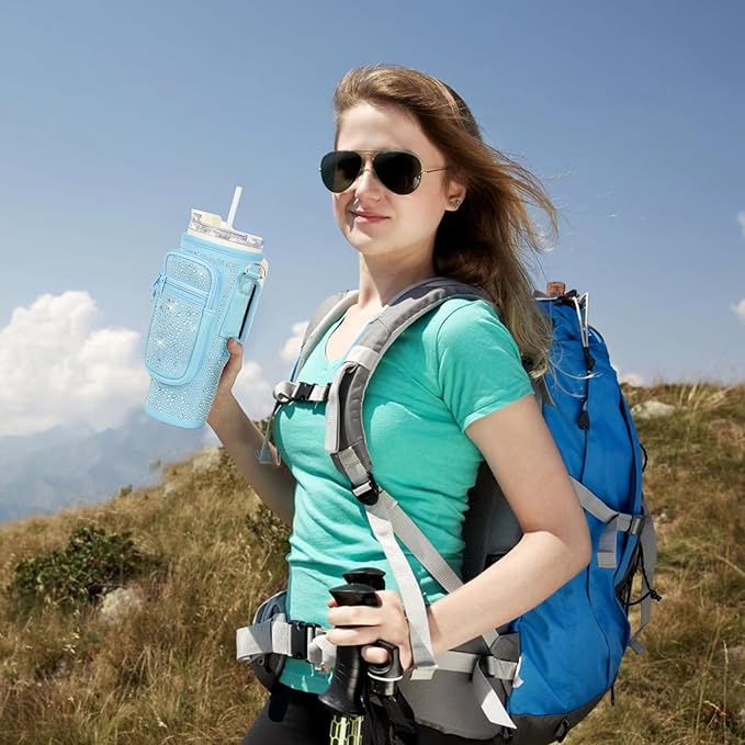 Bling Water Bottle Carrier Bag with Phone Pocket,Water Bottle Holder Bag for Stanley Cup Accessories,Cup Holder with Adjustable Shoulder Strap with Stanley 40 & 30 oz Tumbler,Blue