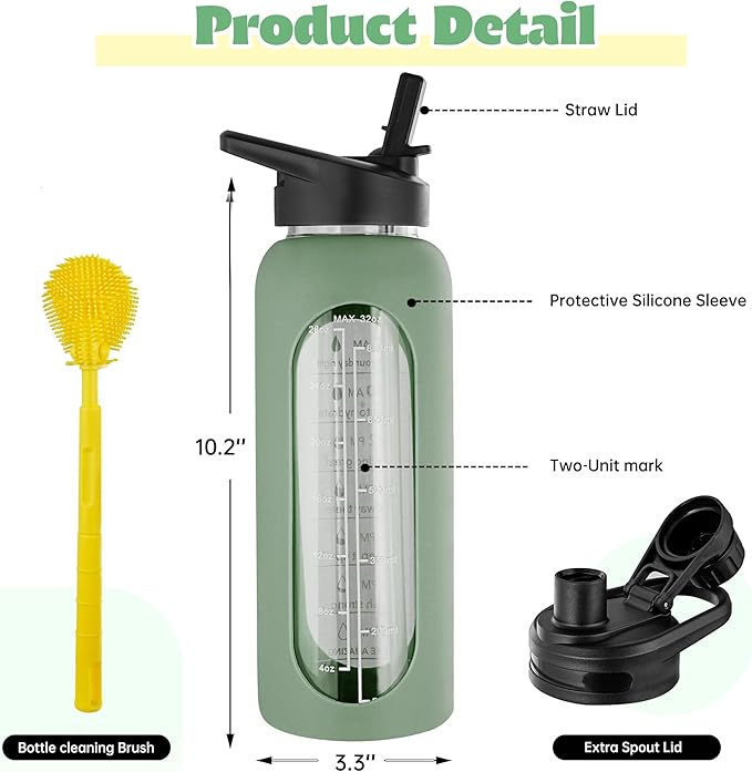 - Stay Hydrated Throughout the Day: staying hydrated is often easier said than done. With the Sierozur glass water bottle and its time reminder, you can now not only track your daily water intake at ease, but also encourage you to drink enough water. This water bottle holds 32oz / 1 Liter, which is the adequate amount to aid your daily hydration routine and it is light to carry
