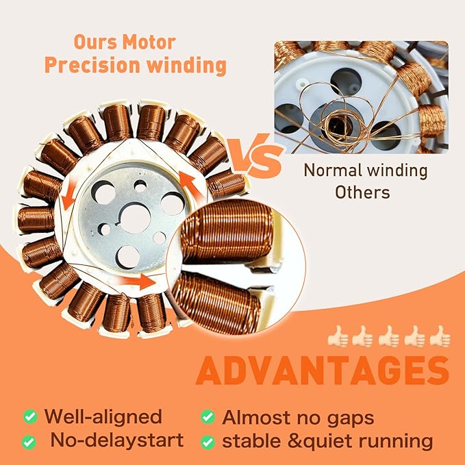 - Our in-house developed advanced BLDC motor with precision winding.Ensures that the three inductors and resistors in this large ceiling fan are almost identical, minimizing differences and significantly enhancing performance.This results in an energy efficiency improvement of 15%, providing a smoother and faster start-up