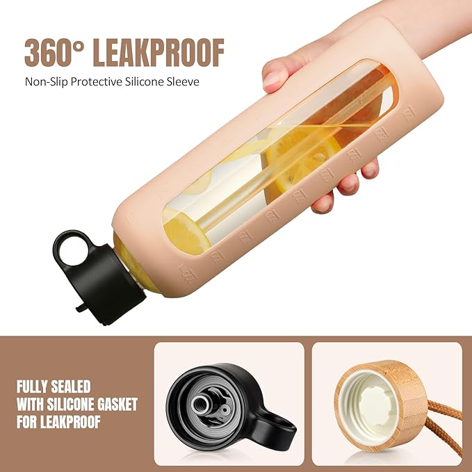 - STAY ON TRACK -Motivational water bottle with silicone sleeve in Capacity Marker and hourly-inspiration Time Marker. With visible window you can always stay on track of your water intake. The glass bottle with Narrow Mouth to Avoid Splash and it fits in small ices cubes or liquid flavorings, small tea bags, etc.Reusable glass cups are more eco friendly. Water tastes fresher from glass and our cute and classy water bottle will help you drink more water than before!