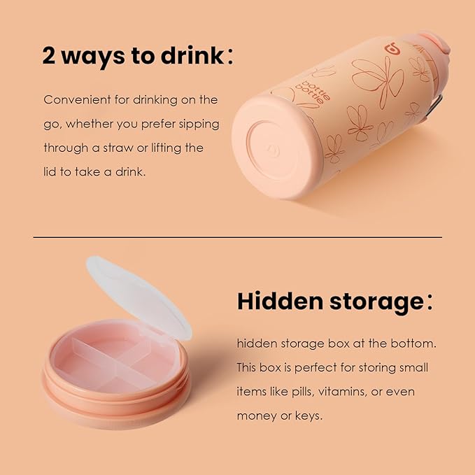 - [With Pill Box]: A storage space at the bottom of the 32 oz water bottle that can be swiveled open. You can use this space to store pills and vitamins, even coins and keys, also could be used as a pet bowl for water and snacks when on outings