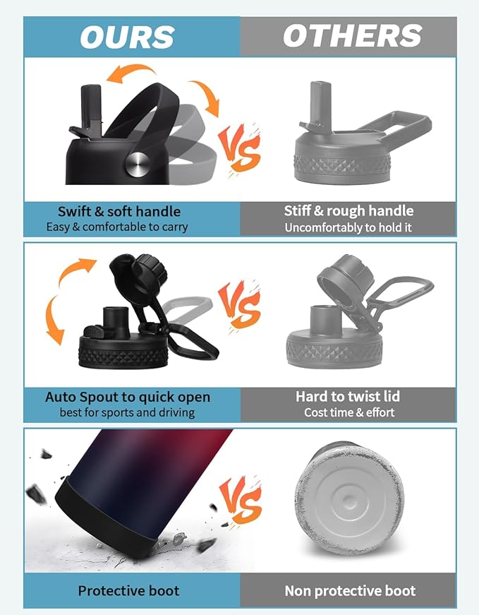 - DRINK WATER ON YOUR WAY:This stainless steel water bottle includes 2 leak-proof lids - 1 straw lid and 1 auto-spout lid - to meet your different drinking needs. The pop-up spout lid is designed for one-handed opening and closing, with a large water outlet for fast drinking. The spill-proof straw lid makes it easy to sip on the go, great for all your outdoor adventures, and also prevents you from inhaling ice cubes.Both are fitted with silicone rings to prevent any spills or leaks.