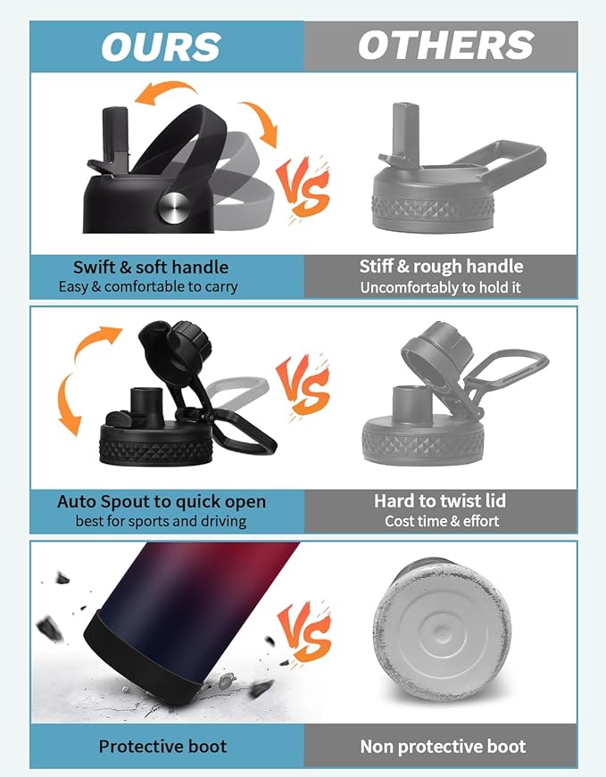 - DRINK WATER ON YOUR WAY: This stainless steel water bottle includes 2 leak-proof lids - 1 straw lid and 1 auto-spout lid - to meet your different drinking needs. The pop-up spout lid is designed for one-handed opening and closing, with a large water outlet for fast drinking. The spill-proof straw lid makes it easy to sip on the go, great for all your outdoor adventures, and also prevents you from inhaling ice cubes.Both are fitted with silicone rings to prevent any spills or leaks.