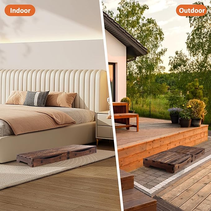 - Pine Wood Foot Step Tool: Choose solid natural pine wood as raw material, the thickness is 1.5cm, it has a strong construvture, which make it's sturdy enough to hold a maxium weight of 500lbs. With color burning treatment on the surface, it's waterproof and rot-resistant, has a long using life.