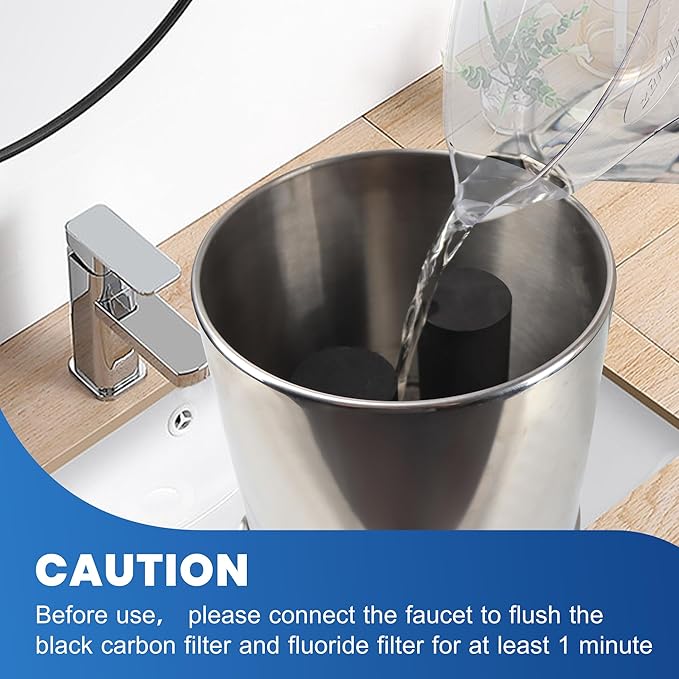- NOTE:Please note that you have to totally submerge the carbon filter about once a week in order for the drip system to siphon properly.Please connect the faucet to flush the black carbon filter and fluoride filter for at least 1 minute before use In order to wash loose activated carbon powder away in advance