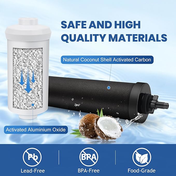 - HIGH QUALITY MATERIALS:The water filter uses natural filter material and premium drilled carbon sintering process, Not only do we firmly control the filter material ,using coconut shell carbon and granular activated carbon from food grade raw materials, but also the use of lead-free and BPA-free materials to produce filter shells