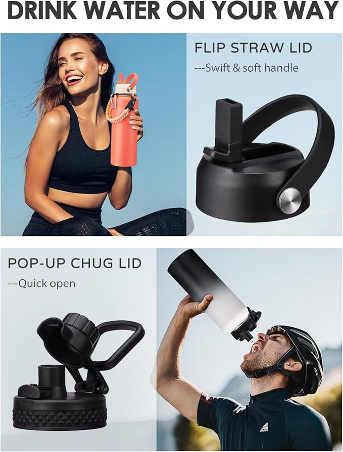 - 2 LEAKPROOF LIDS OPTIONS: This stainless steel water bottles with STRAW LID and AUTO SPOUT LID, both BPA-Free, leak-proof and one-hand control design, great car must have things! The pop-up spout lid for easy drinking and seals shut for no leaks when you're on the go. The straw lid makes it easy to enjoy spill-proof sips, and package come with a alternative straw & a straw brush for easy cleaning.