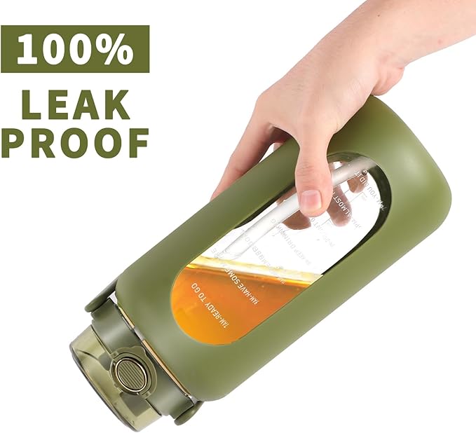 64oz Glass Water Bottle with Straw and Handle - Half Gallon Motivational Water Jug with Time Marker and Silicone Sleeve, Leak proof Wide Mouth Water Flask for Gym, Sports, and Daily Use (Green)