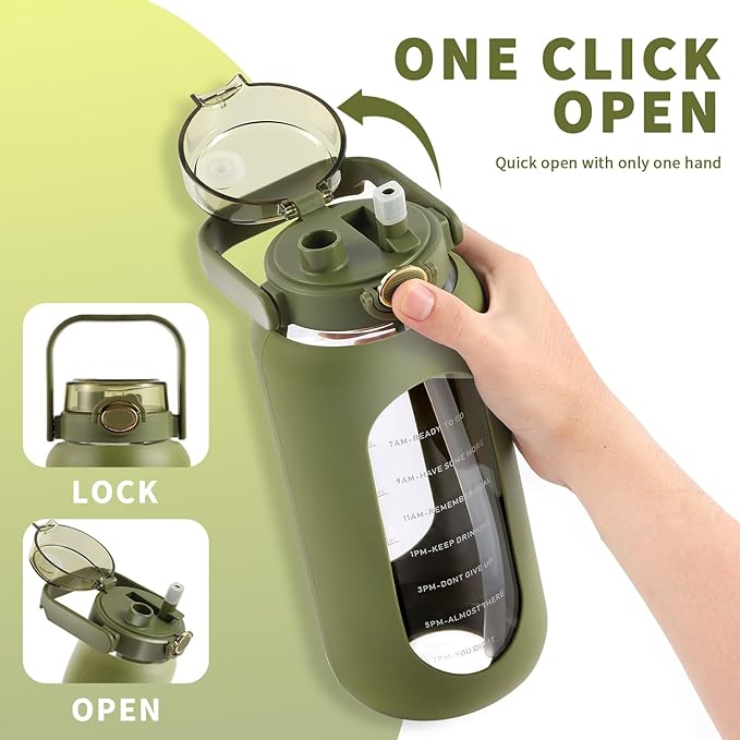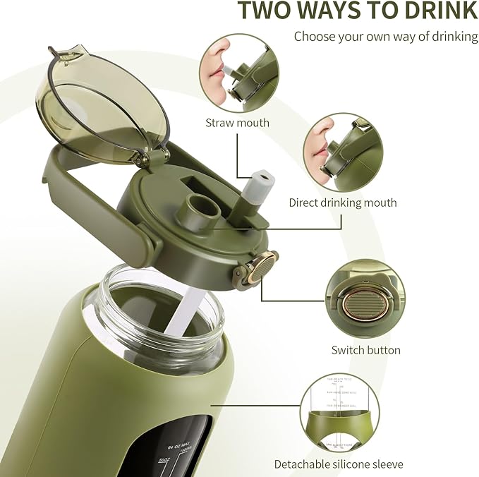 - Straw Spout: Our 64 oz glass water bottle is available in various colors to suit your preferences and needs. To take a sip, simply unlock the cap and drink from the spout. When it's time to refill your bottle with water and ice, you can remove the entire lid to reveal the wide mouth, making it easy to add large ice cubes and fruit.
