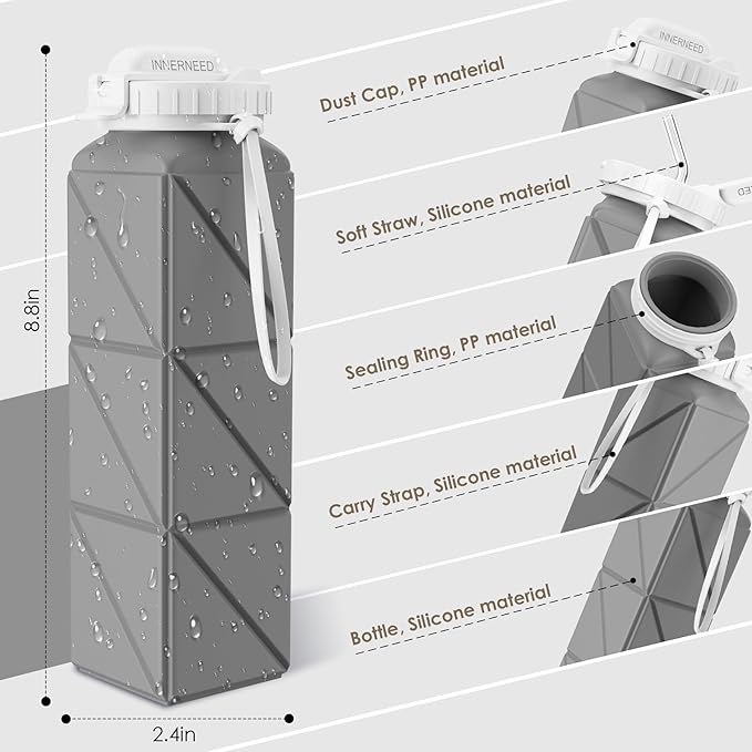 - COLLAPSIBLE FOR EASY CARRYING: Say goodbye to bulky! The INNERNEED Collapsible Water Bottle with straw brings unparalleled convenience to everyday life. It is designed to fold up into a palm size when not in use, and the lightweight of the bottle makes it easier to carry in your bag or pocket. The folded size is 2.9 inches (H) * 2.6 inches (W). Weight: 156g (0.34lb)