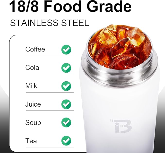 - DOUBLE WALL INSULATION: Our water bottle is made from high-quality 18/8 food-grade stainless steel, rust-proof, BPA-free, lead-free, and easy to wash. This wide mouth water bottle features double-walled vacuum insulation, which can keep your beverages cold for 24 hours and hot for 12 hours with a fresh taste. The wide mouth design is perfect for ice cubes and easy to clean.