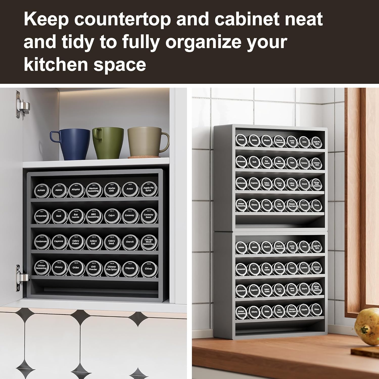 - Multiple Scenarios: You can place the spice shelf on the cabinet or tabletop to keep countertops, cabinets and shelves tidy and fully organize your cabinet space.