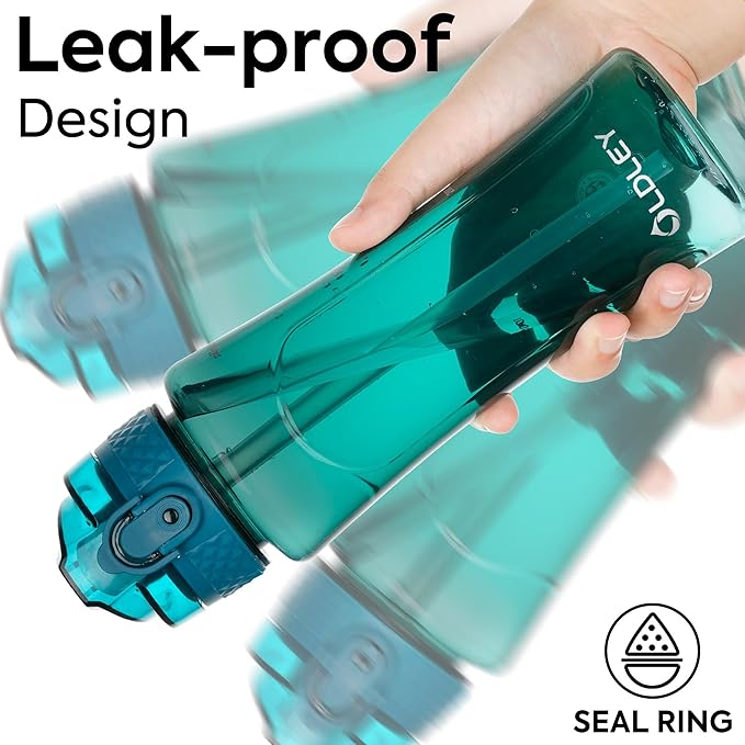 OLDLEY Kids Water Bottle with Straw 15 oz BPA-Free Leak-Proof Motivational Water Bottles with Time Marker for School Sports Travel Gym, Easy to Use for Girls Goys, 1 Straw Lid,Transparent-dark green