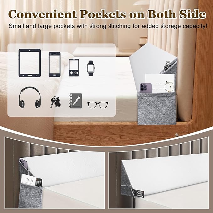 - CONVENIENT TWO SIDE POCKETS: Our bed gap filler features two pockets on each side, providing convenient storage space for your essentials. One large and one small pocket on each side offer plenty of room for keeping items like your phone, remote control, or reading materials within reach.