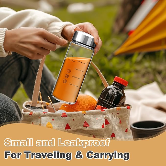 - MEETS CONVENIENCE : With wide mouths and convenient measurement markings, our bottles are designed for ease of use. It's easier than ever to take your healthy homemade juices and smoothies with you when you carry them in your glass juice bottles. These glass bottles can be placed right next to you in the car, in the cup holder, ready for use on the go