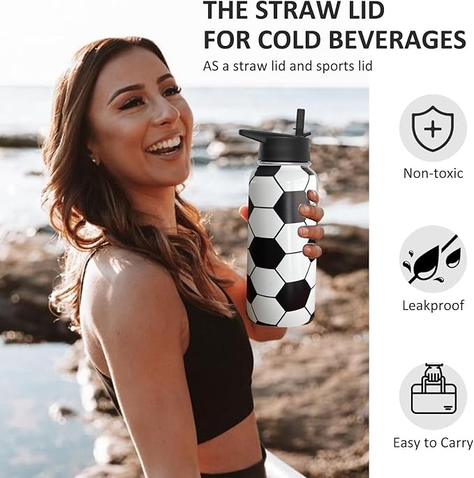 32 oz Soccer Water Bottle Insulated Vacuum Stainless Steel Sports Water Bottle with 2 Lids (Straw and Spout Lid) for Gym Camping Hiking
