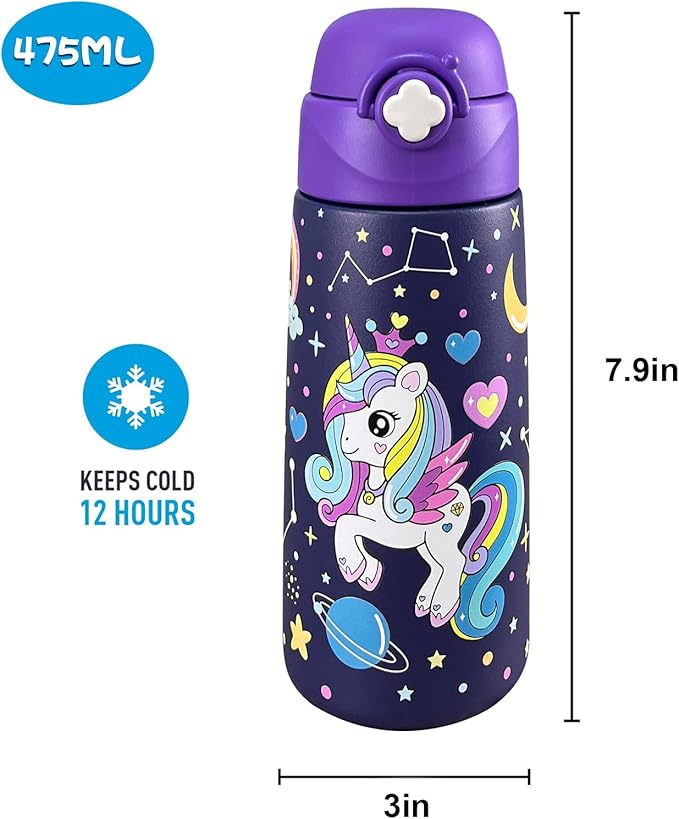 Kids Insulated Water Bottle with Covered Pop-Up Straw,16oz Kids Cups with Stainless Steel Leak Proof for School Boys Girls(Purple Unicorn)
