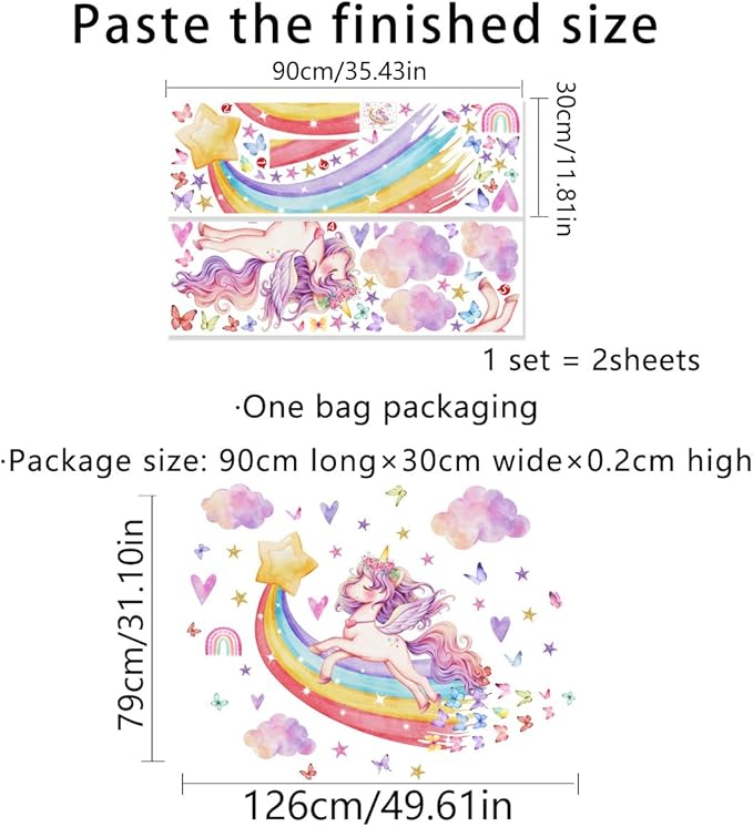 - Dimensions: Each unicorn decal measures approximately 12 inches (30.5 cm) tall, with varying sizes for the other elements.