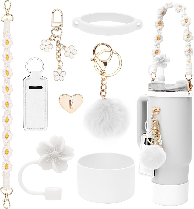 - 【The set includes】1pcs water bottle handle strap, 1pcs water bottle boot, 1pcs silicone straw cover, 1pcs pompom ball, 1pcs daisy key-chain, 1pcs heart hook, 1pcs Chapstick Holder Keychain. The product does not include cups.