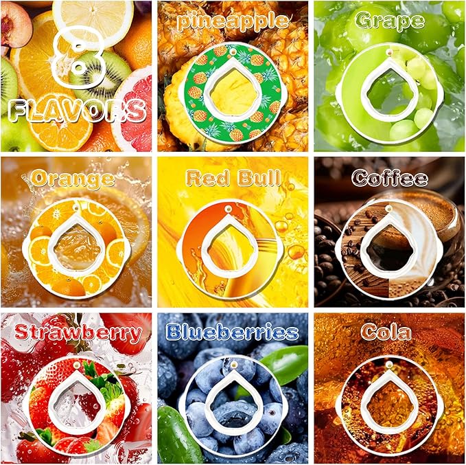 - 【ENJOYABLE FLAVOR VARIETY】Featuring 8 delightful aroma rings, including Orange, cola, rb, pineapple, green grapes, coffee, strawberry and bluebery,our air water bottle with fruit pods,Air water flavor pods give you a different sensory experience.Convenient and easy to use, these straw water bottles can be refilled multiple times, catering to your daily water intake and promoting a healthy lifestyle.