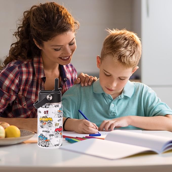12oz Kids Insulated Water Bottle with Flip Straw & Big Handle, Monster Truck, Double Wall 18/8 Stainless Steel, Leakproof Gift for Kids Boys to School Travel Sports, Hands Wash Only, White