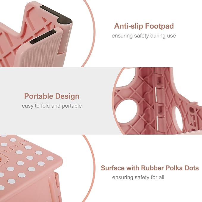 - Safety Design: Our foldable step stool for adults is equipped with a non-slip top and rubber bottom to prevent slips. Plus, this one step stool has a safety lock buckle to avoid accidental folding. With smooth rounded corners, the fold up stool keeps children safe from bumps.