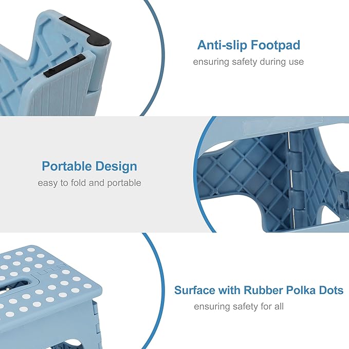 - Safety Design: Our foldable step stool for adults is equipped with a non-slip top and rubber bottom to prevent slips. Plus, this one step stool has a safety lock buckle to avoid accidental folding. With smooth rounded corners, the fold up stool keeps children safe from bumps.
