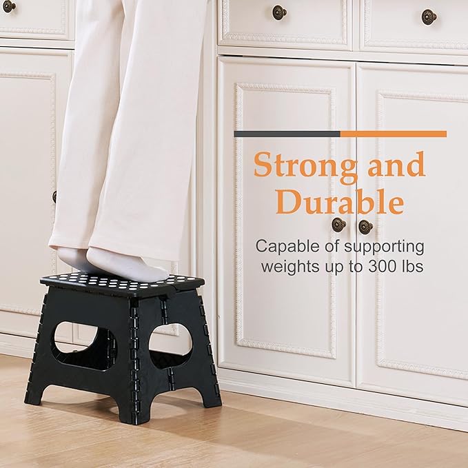 - Safety Design: Our foldable step stool for adults is equipped with a non-slip top and rubber bottom to prevent slips. Plus, this one step stool has a safety lock buckle to avoid accidental folding. With smooth rounded corners, the fold up stool keeps children safe from bumps.