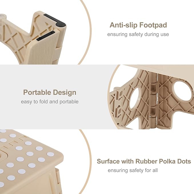 - Safety Design: Our foldable step stool for adults is equipped with a non-slip top and rubber bottom to prevent slips. Plus, this one step stool has a safety lock buckle to avoid accidental folding. With smooth rounded corners, the fold up stool keeps children safe from bumps.